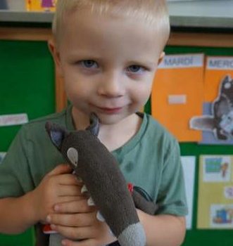 Les enfants posent avec P’tit Loup, la mascotte de la classe ! Il va bientôt partir en week-end chez les copains avec sa petite valise pour vivre de nouvelles aventures !