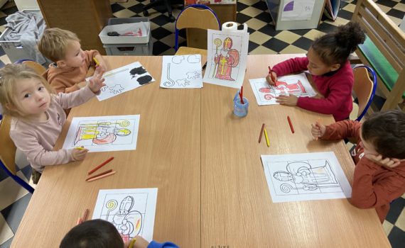 Dans la classe de madame Alice, en attendant la visite du grand Saint Nicolas, divers ateliers d’apprentissages et d’entraînements à l’image du grand Saint ont été proposés en mathématique, motricité fine, français, développement artistique, éveil musical ainsi qu’en psychomotricité avec madame Isabelle.