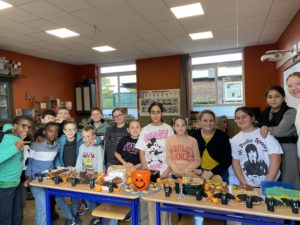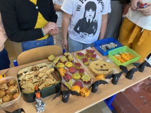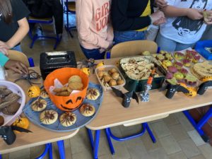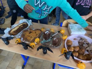 Ceux-ci se sont donnés à fond pour préparer diverses douceurs qui étaient aussi délicieuses qu’effrayantes: crêpes, beignets, bonbons, cookies, biscuits zombie, pop cake, gâteaux, cup cake sorcières et citrouilles… Ils ont tous mis la main à la pâte pour faire de cette vente une véritable réussite; de la réalisation jusqu’à la vente!