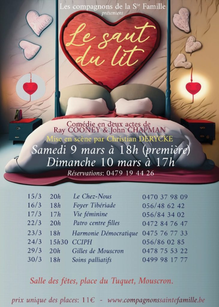 Cette année, ils nous joueront une pièce de Ray Cooney & John Chapman “Le saut du lit”, dans une mise en scène de Chrisitan Derycke.