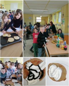 Ce jeudi 1e février, les élèves de Mme Marie-Élise et ceux de Mme Orlane ont eu la chance de réaliser des crêpes ! Ils ont pu les déguster selon leurs goûts : crème chantilly, pâte à tartiner au chocolat, confiture, sirop d’érable… Un bon petit goûter ! Ils se sont régalés 🥞🥤.
