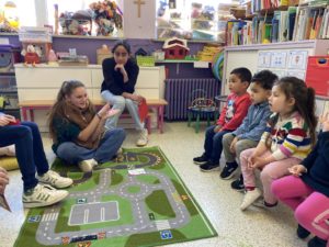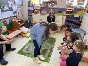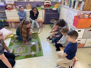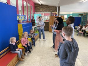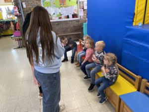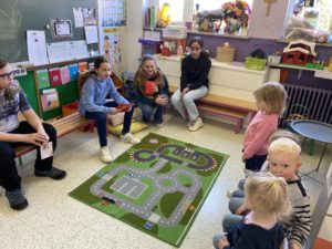 Ce jeudi 18 avril, les élèves de 6e primaire de Mme Pauline se sont rendus dans l’implantation du Clos de la Quièvre, dans la classe de Mme Anne en 1ère maternelle!