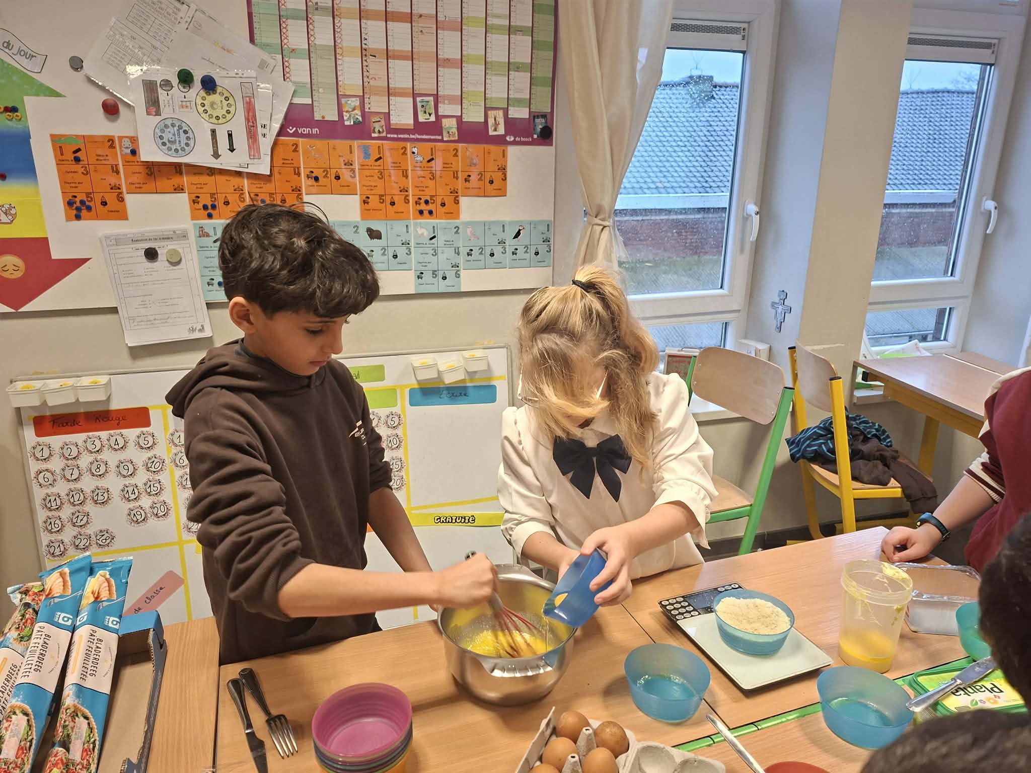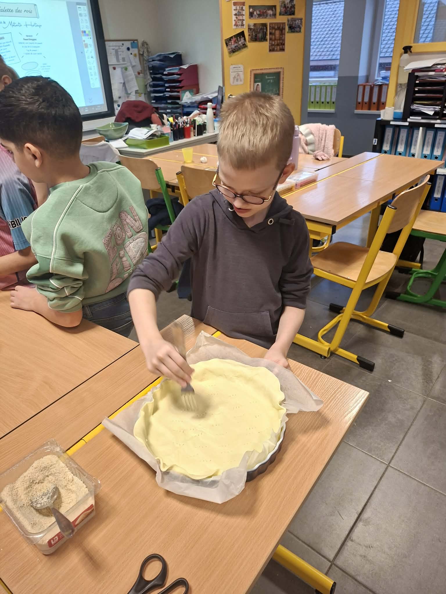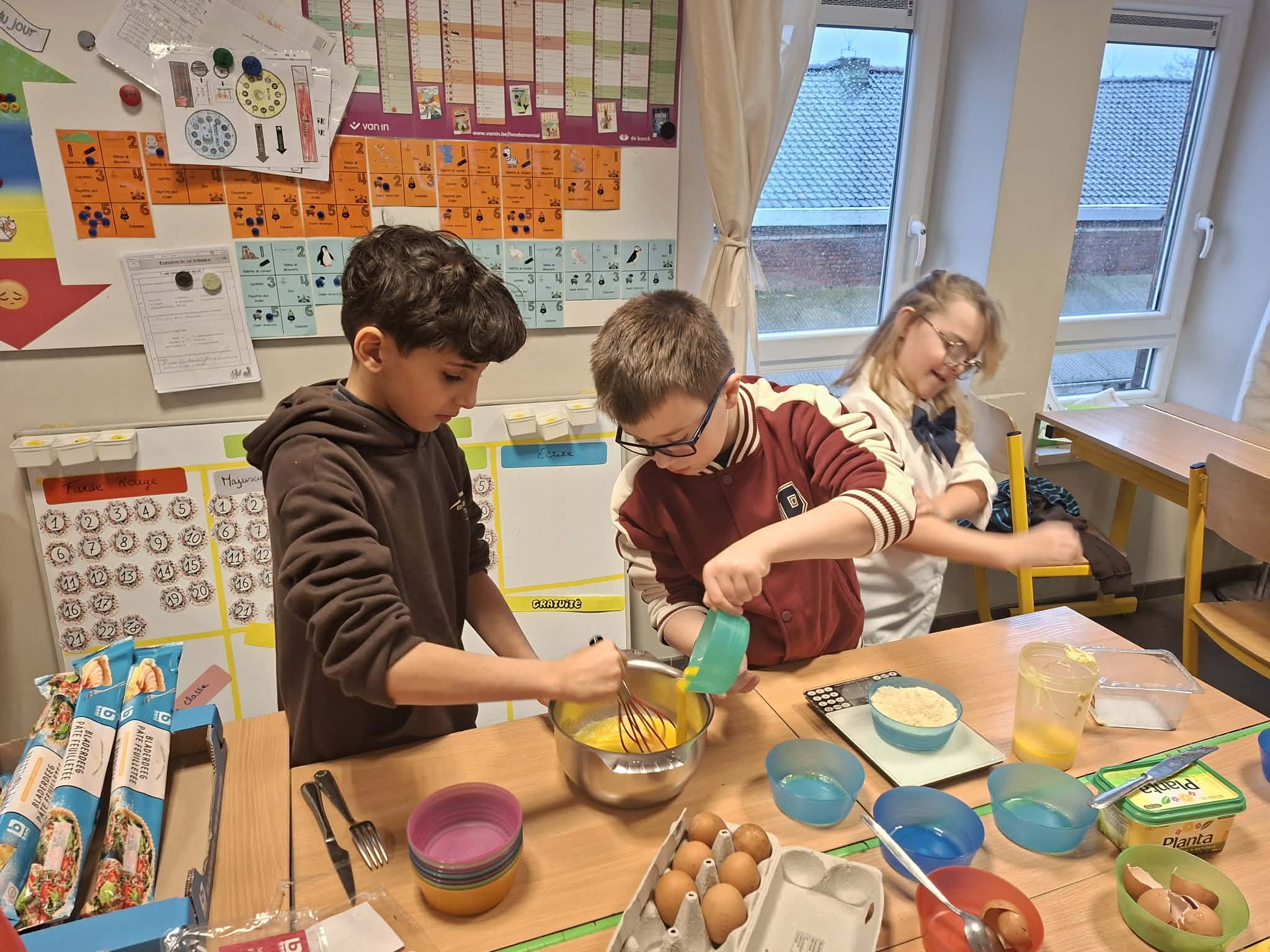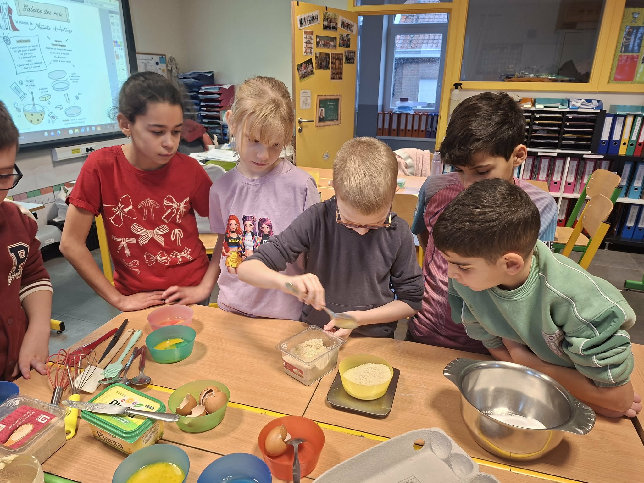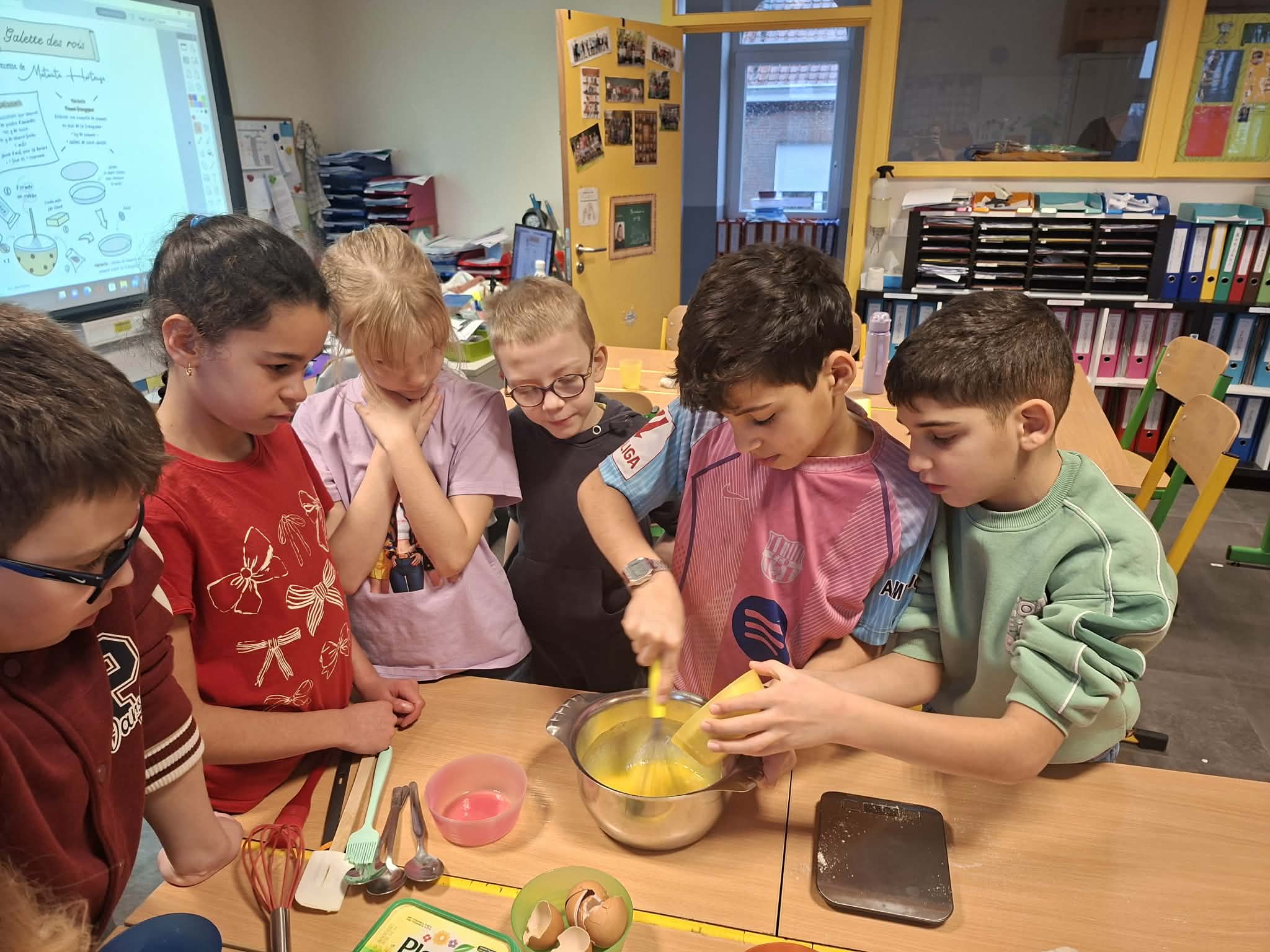 Ce vendredi 09 janvier, les élèves de P3/P4 ont cuisiné leurs galettes des rois. Nous avons découvert la recette ensemble :