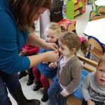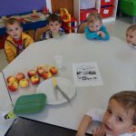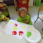 Nous avons également découvert la pomme dans tout son état. Empreinte de pommes en peinture, réalisation d’une compote de pommes, d’une tarte et nous avons également appris la comptine « J ‘aime les pommes ».