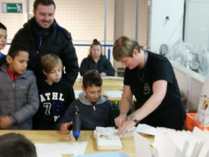 Nos élèves étaient également munis de cartes « Waouh » et « Beurk » afin d’y noter leurs remarques positives (par exemple : Il y a de la musique dans l’usine, les gens ont l’air heureux, ils ont un jardin pour leurs pauses, leur travail est bien adapté pour les personnes qui ont un handicape, tout est bien rangé… ) et leurs remarques à améliorer (par exemple : les pauses sont trop courtes, le jardin pourrait être plus grand, à certains endroits ça puait le plastique brûlé, il y a beaucoup de bruit…).