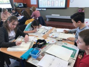 Cette dernière venait leur enseigner l’art de réaliser un portrait. Les enfants ont d’abord appris l’importance de « lâcher la main » puis les proportions à respecter (et même là on fait des fractions!) pour dessiner un portrait. Une fois les notions apprises, les enfants se sont exercés en réalisant le portrait de leur voisin d’en face.