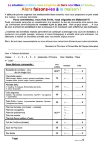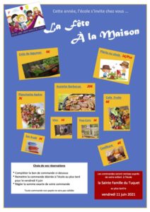 L’école ne cesse de se réinventer et vous propose une fête sous une forme différente ; la fête à la maison en distanciel. Vous trouverez donc ci-dessous l’affiche de “La fête à la Maison” et son bon de commande également disponible à l’école en version papier.